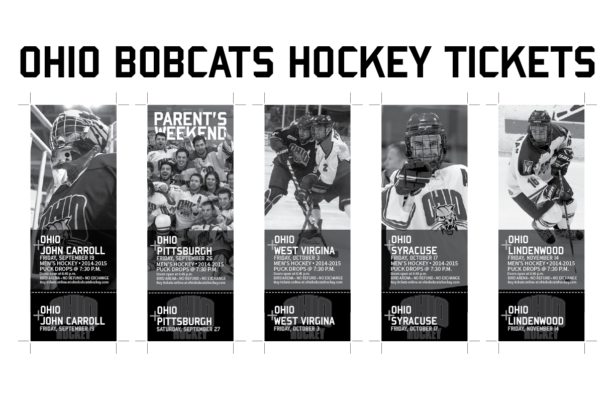 The tickets rotate through a series of designs, shown here, though out the season. They are printed on colored paper, aqua blue on Friday night and neon green on Saturday night.