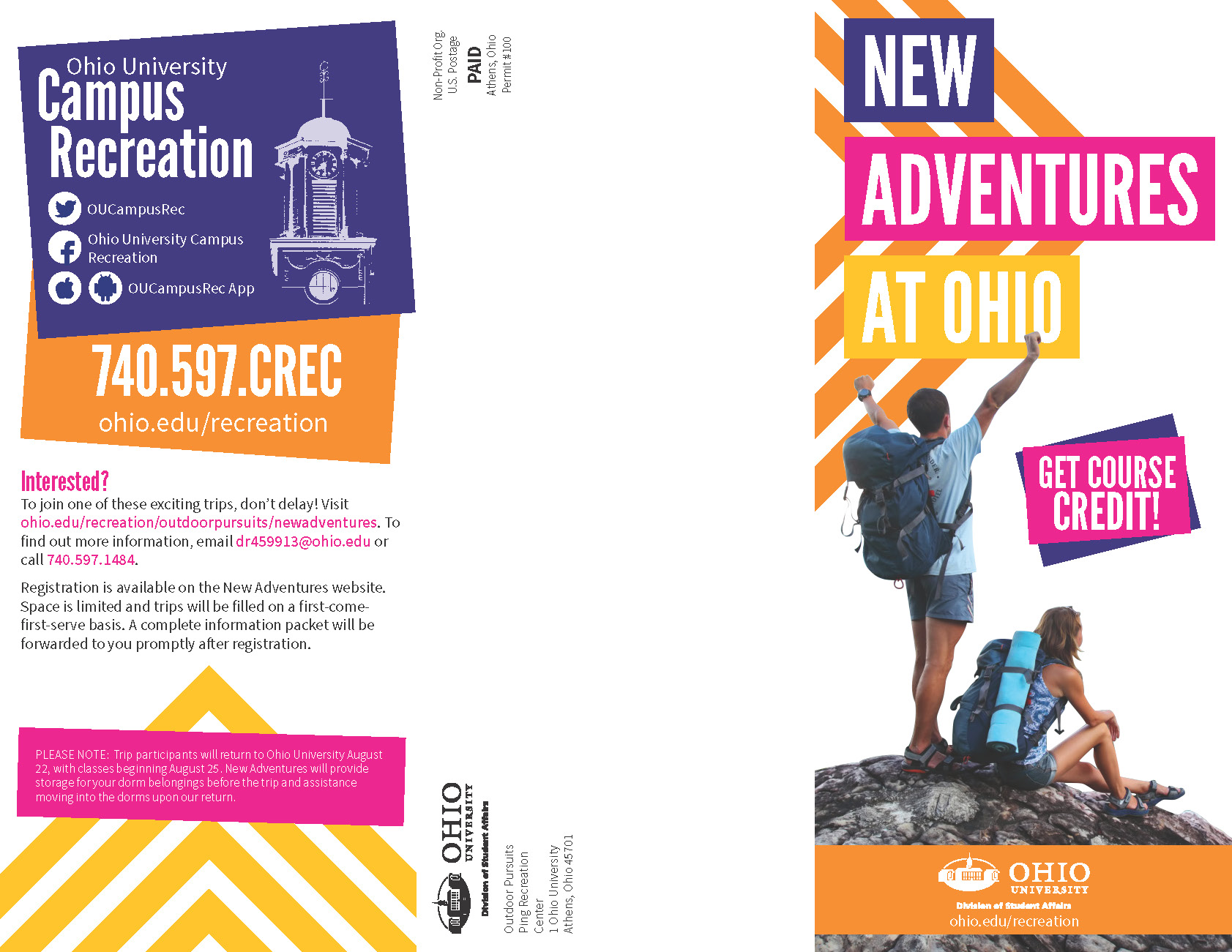 Additionally, we wanted to pick new typography. Frutiger is Ohio University’s designated san serif, which we have to use, so we decided to use that for all of our body copy. Next, we wanted to choose our own typeface for headlines. After figuring out what went well with Frutiger and what fit with our brand, we decided to pick two typefaces, Bebas Neue and Calvert MT. Both provide this youthful vibe that we loved. After trial and error, we have decided to use Bebas Neue for large format pieces (because it reads well large) and Calvert MT for smaller pieces.